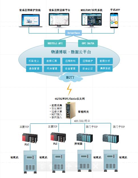 ,传统制氧机管理方式多依赖人工巡检与本地操作,存在实时监控不足、故障响应滞后、能耗统计不精确及数据孤立等问题,严重制约了生产效率与运营优化。 物通博联提供基于工业数采网关的物联网解决方案,能够无缝接入制氧机的