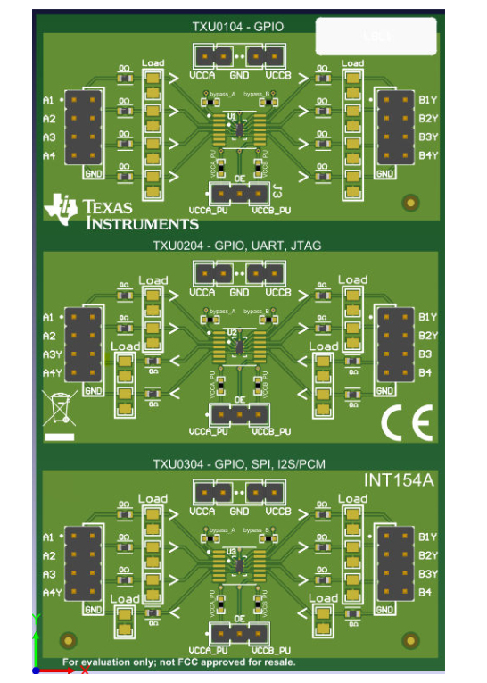 Texas Instruments TXU-EVM评估模块设计用于支持评估采用DTR和PW封装的TXU0104、TXU0204和TXU0304器件。该评估板设有多个接头