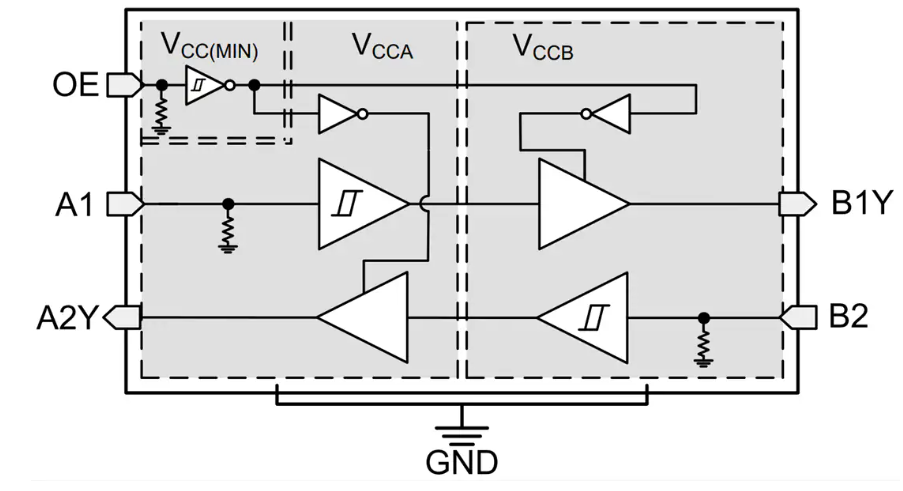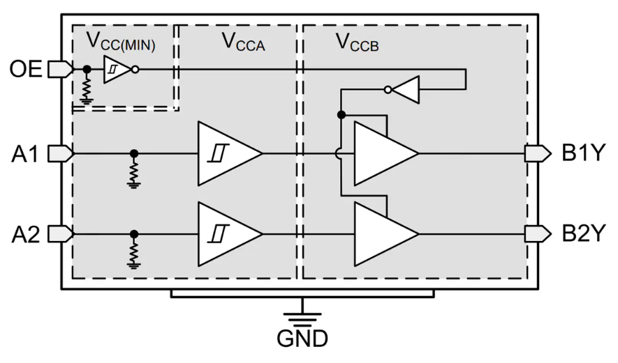Texas Instruments TXU0102电压电平转换器是一款2位、双电源非反向固定方向电压电平转换器件。Ax引脚以V~CCA~逻辑电平为基准,OE引脚可以V~CCA~或V~CCB~逻辑电平